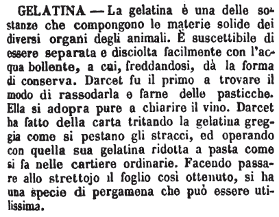 | Gelatina - La gelatina è una delle sostanze che compongono le materie solide dei diversi organi degli animali. E' suscettibile di essere separata e disciolta facilmente con l'acqua bollente, a cui, freddandosi, dà la forma di conserva. Darcet fu il primo a trovare il modo di rassodarla e farne delle pasticche. Ella si adopra pure a chiarire il vino. Darcet ha fatto della carta tritando la gelatina greggia come si pestano gli stracci, ed operando con quella sua gelatina ridotta a pasta come si fa nelle cartiere ordinarie. Facendo passare allo strettojo il foglio così ottenuto, si ha una specie di pergamena che può essere utilissima. [immagine] |