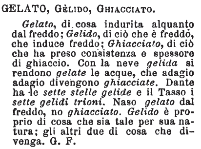 | Gelato, Gelido, Ghiacciato - Gelato, di cosa indurita alquanto dal freddo; Gelido, di ciò che è freddo, che induce freddo; Ghiacciato, di ciò che ha preso consistenza e spessore di ghiaccio. COn la neve gelida si rendono gelate le acque, che adagio adagio divengono ghiacciate. Dante ha le sette stelle gelide e il Tasso i sette gelidi trioni. Naso gelato dal freddo, no ghiacciato. Gelido è proprio di cosa che sia tale per sua natura; gli altri due di cosa che divenga. G. F. [immagine] |