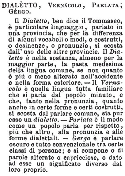 | Dialetto, Vernacolo, Parlata, Gergo - Il Dialetto, ben dice il Tommaseo, è particolare linguaggio, parlato in una provincia , che per la differenza di alcuni vocaboli o modi, o costrutti, o desinenze, o pronunzie, si scosta dall’uso delle altre provincie. Il Dialetto è nella sostanza, almeno per la maggior parte, la pasta medesima della lingua comune, se non quanto è più o meno alterato nell’accidente e nella forma esteriore. – Il Vernacolo è quella lingua tutta familiare che si parla dal popolo minuto, e che, tanto nella pronunzia, quanto anche in certe forme e certi costrutti, si scosta dal parlare comune, sia pur esso un dialetto. - Parlata è il modo come un popolo parla per rispetto, più che altro , alla pronunzia e alle forme dialettali. - Gergo è parlare oscuro e tutto convenzionale tra certe classi di persone; e si compone o di parole alterate o capricciose, o dato ad esse un significato diverso dal loro proprio. [immagine] |
