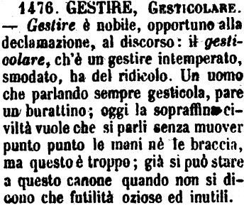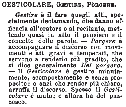 | Gestire, Gesticolare - Gestire è nobile, opportuno alla declamazione, al discorso: il gesticolare, ch'è un gestire intemperato, smodato, ha del ridicolo. Un uomo che parlando sempre gesticola, pare un burattino; oggi la sopraffina civiltà vuole che si parli senza muover punto punto le mani nè le braccia, ma questo è troppo; già si può stare a questo canone quando non si dicono che futilità oziose ed inutili. [immagine] |