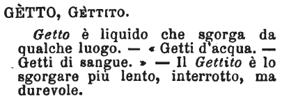 | Getto, Gettito - Getto è liquido che sgorga da qualche luogo. - « Getti d'acqua. - Getti di sangue. » - Il Gettito è lo sgorgare più lento, interrotto, ma durevole. [immagine] |
