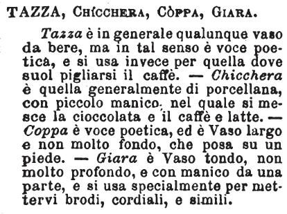| Tazza, Chicchera, Coppa, Giara - Tazza è in generale qualunque vaso da bere, ma in tal senso è voce poetica, e si usa invece per quella dove suol pigliarsi il caffè. - Chicchera è quella generalmente di porcellana, con piccolo manico, nel quale si mesce la cioccolata e il caffè e latte. - Coppa è voce poetica, ed è Vaso largo e non molto fondo, che posa su un piede. - Giara è Vaso tondo, non molto profondo, e con manico da una parte, e si usa specialmente per mettervi brodi, cordiali, e simili. [immagine] |