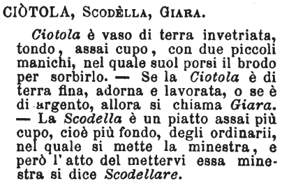 | Ciotola, Scodella, Giara - Ciotola è vaso di terra invetriata, tondo, assai cupo, con due piccoli manichi, nel quale suol porsi il brodo per sorbirlo. - Se la Ciotola è di terra fina, adorna e lavorata, o se è di argento, allora si chiama Giara. - La Scodella è un piatto assai più cupo, cioè più fondo, degli ordinarii, nel quale si mette la minestra, e però l'atto del mettervi essa minestra si dice Scodellare. [immagine] |