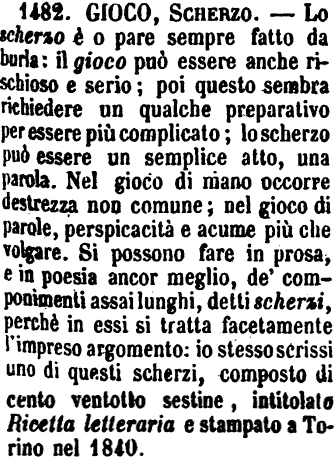 | Gioco, Scherzo - Lo scherzo è o pare sempre fatto da burla: il gioco può essere anche rischioso e serio; poi questo sembra richiedere un qualche preparativo per essere più complicato; lo scherzo può essere un semplice atto, una parola. Nel gioco di mano occorre destrezza non comune; nel gioco di parole, perspicacità e acume più che volgare. Si possono fare in prosa, e in poesia ancor meglio, de' componimenti assai lunghi, detti scherzi, perchè in essi si tratta facetamente l'impreso argomento: io stesso scrissi uno di questi scherzi, composto di cento ventotto sestine, intitolato Ricetta letteraria e stampato a Torino nel 1840. [immagine] |