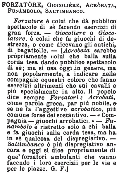 | Forzatore, Giocoliere, Acrobata, Funambolo, Saltimbanco - Forzatore è colui che dà pubblico spettacolo di sè facendo esercizii di gran forza. - Giocoliere o Giocolatore, è colui che fa giuochi di destrezza, o come dicevano gli antichi, di bagattelle. - [Acrobata sarebbe propriamente colui che balla sulla corda tesa dando pubblico spettacolo di sè; ma si usa oggi in genere, ma non popolarmente, a indicare nelle compagnie equestri coloro che fanno esercizii altrimenti che sui cavalli e più specialmente in alto. Il popolo dice sempre Forzatori; Acrobati, come parola greca, par più nobile, e se ne fa l'aggettivo acrobatico, più comune forse del sostantivo. - «Compagnia - giuochi acrobatici.» - Funambolo è ristretto solo a chi balla e fa giuochi sulla corda tesa, ma ha in sè qualcosa del dispregiativo. - Saltimbanco è più dispregiativo ancora e oggi si dice propriamente di que' forzatori ambulanti che vanno facendo i loro esercizii per le vie e per le piazze. G. F.] [immagine] |