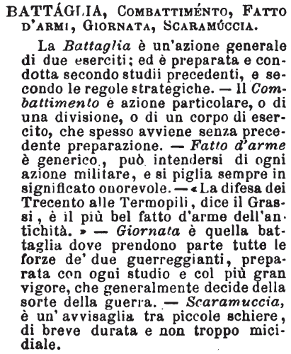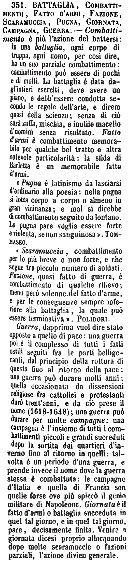 | Battaglia, Combattimento, Fatto d'armi, Fazione, Scaramuccia, Pugna, Giornata, Campagna, Guerra - Combattimento è più l'azione del battersi: in una battaglia, ogni corpo di truppa, ogni uomo, per così dire, ha un suo parziale combattimento: combattimento può essere di pochi e di molti. La battaglia è data dagl'intieri eserciti, deve avere un piano, e debb'essere condotta secondo le regole dell'arte, e direm quasi della scienza; senza di ciò sarà zuffa, mischia, e inutile macello d'uomini senza risultato. Fatto d'armi è combattimento memorabile per qualche bel tratto o altra notevole particolarità: la sfida di Barletta è un memorabile fatto d'armi.