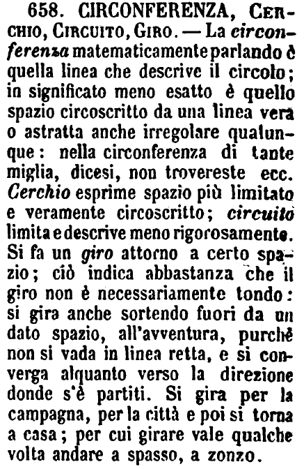 | Circonferenza, Cerchio, Circuito, Giro - La circonferenza matematicamente parlando è quella linea che descrive il circolo; in significato meno esatto è quello spazio circoscritto da una linea vera o astratta anche irregolare qualunque: nella circonferenza di tante miglia, dicesi, non trovereste ecc. Cerchio esprime spazio più limitato e veramente circoscritto; circuito limita e descrive meno rigorosamente. Si fa un giro attorno a certo spazio; ciò indica abbastanza che il giro non è necessariamente tondo: si gira anche sortendo fuori da un dato spazio, all'avventura, purchè non si vada in linea retta, e si converga alquanto verso la direzione donde s'è partiti. Si gira per la campagna, per la città e poi si torna a casa; per cui girare vale qualche volta andare a spasso, a zonzo. [immagine] |