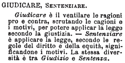 | Giudicare, Sentenziare - Giudicare è il ventilare le ragioni pro e contra, scrutando le cagioni e i motivi, per potere applicar la legge secondo la giustizia. - Sentenziare è applicare la legge, secondo le regole del diritto e della equità, significandone i motivi. La stessa diversità è tra Giudizio e Sentenza. [immagine] |