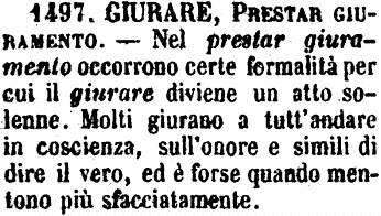 | Giurare, Prestar giuramento - Nel prestar giuramento occorrono certe formalità per cui il giurare diviene un atto solenne. Molti giurano a tutt'andare in coscienza, sull'onore e simili di dire il vero, ed è forse quando mentono più sfacciatamente. [immagine] |
