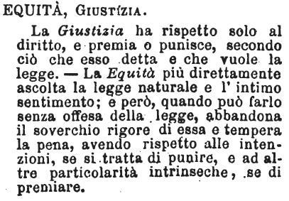 | Equità, Giustizia - La Giustizia ha rispetto solo al diritto, e premia o punisce, secondo ciò che esso detta e che vuole la legge. - La Equità più direttamente ascolta la legge naturale e l'intimo sentimento; e però, quando può farlo senza offesa della legge, abbandona il soverchio rigore di essa e tempera la pena, avendo rispetto alle intenzioni, se si tratta di punire, e ad altre particolarità intrinseche, se di premiare. [immagine] |