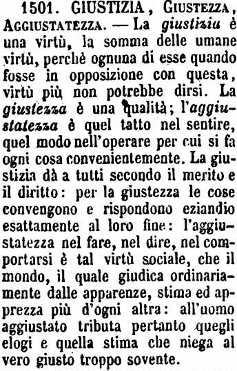 Giustizia, Equità, Rettitudine, Rettezza, Dirittura, Probità - La giustizia ha la sua base nei principii inalterabili della verità e del diritto; l'equità è fondata in gran parte sul sentimento; e questo sentimento, ch'è voce della coscienza, contiene in germe que' principii da tutti appunto sentiti in complesso, in confuso, ma sufficienti a farci pronunziare in tutti i casi un sì o un no, un licet, un non licet, senza saperne dare una precisa ragione: i giudici adunque pronunziano le loro sentenze secondo la giustizia legale; i giurati, la loro opinione, secondo l'equità. La giustizia legale dipende in qualche sua parte dalle particolari costituzioni de' paesi, cosicchè ciò che è lecito in un paese è giustiziabile in un altro: questa giustizia umana però, convenzionale affatto, avrà suo rimedio efficace dall'affratellamento delle nazioni, e dalla concordanza universale de' codici civili e delle costituzioni politiche; cosa che noi non vedremo certamente, ma che prepariamo ai pronipoti nostri. I giudici, i tribunali, i senati meritamente son detti: la giustizia. Il bargello, i birri quando vanno a battere alla porta del cittadino, forse innocente, per catturarlo, dicono di sè: aprite, è la giustizia!... profanazione! sacrilegio! La rettitudine sta nel naturale buon senso, nella voce della coscienza non viziata per anco da pregiudizii, da sofismi, da passioni: chi dirittamente sente, dirò così, rettamente giudica; chi però rettamente giudica, non sempre equamente e giustamente opera: video meliora, proboque, è atto del retto senso; il deteriora sequor è atto umano cui la passione eccita e la fralezza nostra non sa resistere. La probità è l'equità in pratica: l'uom probo non fa cosa cui la più rigorosa giustizia avesse a ridire, non dovesse approvare, probare.
