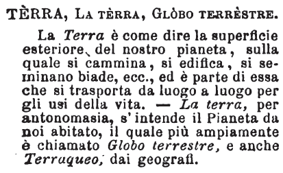 | Terra, La terra, Globo terrestre - La Terra è come dire la superficie esteriore del nostro pianeta, sulla quale si cammina, si edifica, si seminano biade, ecc., ed è parte di essa che si trasporta da luogo a luogo per gli usi della vita. La terra, per antonomasia, s'intende il Pianeta da noi abitato, il quale più ampiamente è chiamato Globo terrestre, e anche Terraqueo, dai geografi. [immagine] |