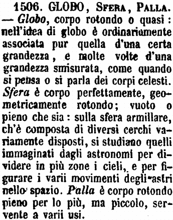 | Globo, Sfera, Palla - Globo, corpo rotondo o quasi: nell'idea di globo è ordinariamente associata pur quella d'una certa grandezza, e molte volte d'una grandezza smisurata, come quando si pensa o si parla dei corpi celesti. Sfera è corpo perfettamente, geometricamente rotondo; vuoto o pieno che sia: sulla sfera armillare, ch'è composta di diversi cerchi variamente disposti, si studiano quelli immaginati dagli astronomi per dividere in più zone i cieli, e per figurare i varii movimenti degli astri nello spazio. Palla è corpo rotondo pieno per lo più, ma piccolo, servente a varii usi. [immagine] |