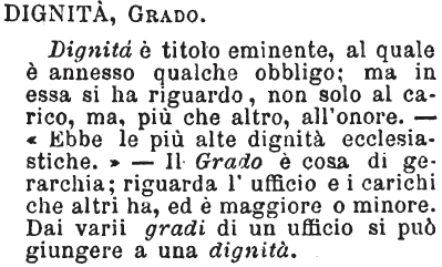| Dignità, Grado - Dignità è titolo eminente, al quale è annesso qualche obbligo; ma in essa si ha riguardo, non solo al carico, ma, più che altro, all'onore. - «Ebbe le più alte dignità ecclesiastiche.» - Il Grado è cosa di gerarchia; riguarda l'ufficio e i carichi che altri ha, ed è maggiore o minore. Dai varii gradi di un ufficio si può giungere a una dignità. [immagine] |