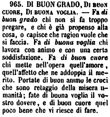 | Di buon grado, Di buon cuore, Di buona voglia - Fa di buon grado chi non si fa troppo pregare, e chi è già propenso alla cosa, o capisce che ragion vuole che si faccia. Fa di buona voglia chi lavora con animo e con una certa soddisfazione. Fa di buon cuore chi mette nell'opera quell'amore, quell'affetto che ne addoppia il merito. Portate di buon animo le croci che sono retaggio della misera umanità; fate di buona voglia il vostro dovere, e di buon cuore quel poco bene che vi riesce di fare. [immagine] |