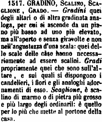 | Gradino, Scalino, Scaglione, Grado - Gradini quei degli altari o di altra gradinata analoga, per cui si ascende da un piano più basso ad uno più elevato, ma all'aperto e senza giravolte e non nell'angustezza d'una scala: quei delle scale delle case hanno necessariamente ad essere scalini. Gradi propriamente quei che sono sull'altare, e sui quali si dispongono i candelieri, i fiori e gli analoghi adornamenti di esso. Scaglione, è scalino di marmo o di pietra più grosso e più largo degli ordinarii: è quello per lo più che mette al portone della casa. [immagine] |