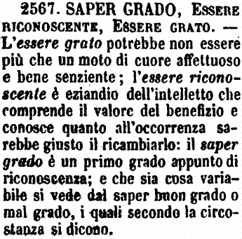 | Saper grado, Essere riconoscente, Essere grato - L'essere grato potrebbe non essere più che un moto di cuore affettuoso e bene senziente; l'essere riconoscente è eziandio dell'intelletto che comprende il valore del benefizio e conosce quanto all'occorrenza sarebbe giusto il ricambiarlo: il saper grado è un primo grado appunto di riconoscenza; e che sia cosa variabile di vede dal saper buon grado o mal grado, i quali secondo la circostanza si dicono. [immagine] |