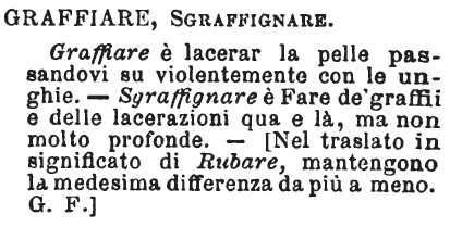 | Graffiare, Sgraffignare - Graffiare è lacerar la pelle passandovi su violentemente con le unghie. - Sgraffignare è Fare de' graffii e delle lacerazioni qua e là, ma non molto profonde. - [Nel traslato in significato di Rubare, mantengono la medesima differenza da più a meno. G.F.] [immagine] |