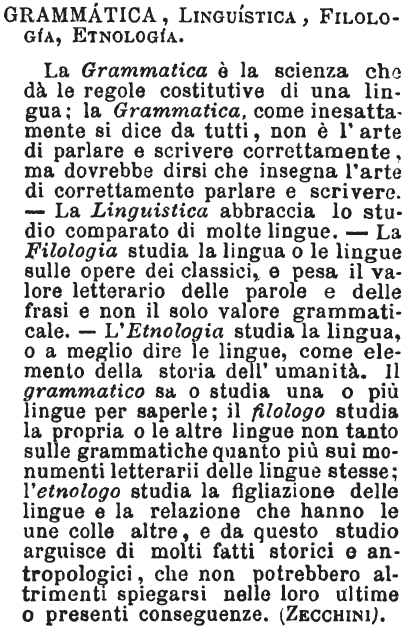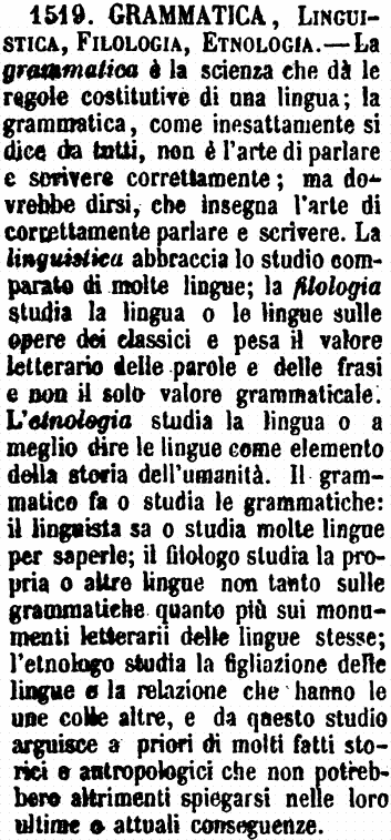 | Grammatica, Linguistica, Filologia, Etnologia - La Grammatica è la scienza che dà le regole costitutive di una lingua; la Grammatica, come inesattamente si dice da tutti, non è l’arte di parlare e scrivere correttamente, ma dovrebbe dirsi che insegna l’arte di correttamente parlare e scrivere. – La Linguistica abbraccia lo studio comparato di molte lingue. – La Filologia studia la lingua o le lingue sulle opere dei classici, e pesa il valore letterario delle parole e delle frasi e non il solo valore grammaticale. – L’Etnologia studia la lingua, o a meglio dire le lingue, come elemento della storia dell’umanità. Il grammatico sa o studia una o più lingue per saperle; il filologo studia la propria o le altre lingue non tanto sulle grammatiche quanto più sui monumenti letterarii delle lingue stesse; l’etnologo studia la figliazione delle lingue e la relazione che hanno le une colle altre, e da questo studio arguisce di molti fatti storici e antropologici, che non potrebbero altrimenti spiegarsi nelle loro ultime o presenti conseguenze. (Zecchini). [immagine] |