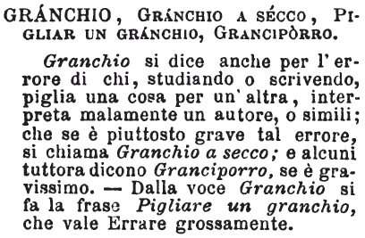 | Granchio, Granchio a secco, Pigliar un granchio, Granciporro - Granchio si dice anche per l'errore di chi, studiando o scrivendo, piglia una cosa per un'altra, interpreta malamente un autore, o simili; che se è piuttosto grave tal errore, si chiama Granchio a secco; e alcuni tuttora dicono Granciporro, se è gravissimo. - Dalla voce Granchio si fa la frase Pigliare un granchio, che vale Errare grossamente. [immagine] |
