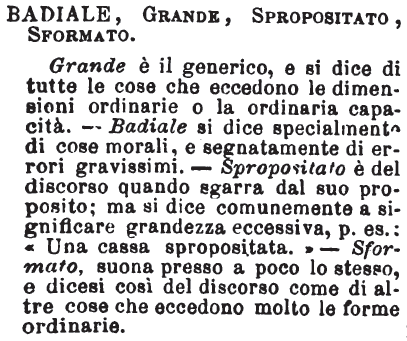 | Badiale, Grande, Spropositato, Sformato - Grande è il generico, e si dice di tutte le cose che eccedono le dimensioni ordinarie o la ordinaria capacità. - Badiale si dice specialmente di cose morali, e segnatamente di errori gravissimi. - Spropositato è del discorso quando sgarra dal suo proposito; ma si dice comunemente a significare grandezza eccessiva, p. es.: « Una cassa spropositata. » - Sformato, suona presso a poco lo stesso, e dicesi così del discorso come di altre cose che eccedono molto le forme ordinarie. [immagine] |