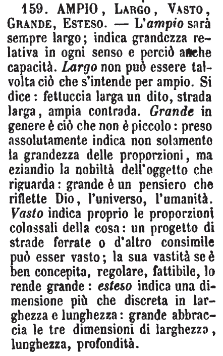 | Ampio, Largo, Vasto, Grande, Esteso - L'ampio sarà sempre largo; indica grandezza relativa in ogni senso e perciò anche capacità. Largo non può essere talvolta ciò che s'intende per ampio. Si dice: fettuccia larga un dito, strada larga, ampia contrada. Grande in genere è ciò che non è piccolo: preso assolutamente indica non solamente la grandezza delle proporzioni, ma eziandio la nobiltà dell'oggetto che riguarda: grande è un pensiero che riflette Dio, l'universo, l'umanità. Vasto indica proprio le proporzioni colossali della cosa: un progetto di strade ferrate o d'altro consimile può esser vasto; la sua vastità se è ben concepita, regolare, fattibile, lo rende grande: esteso indica una dimensione più che discreta in larghezza e lunghezza: grande abbraccia le tre dimensioni di larghezza, lunghezza, profondità. [immagine] |