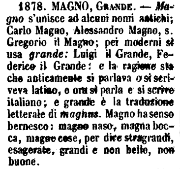 | Magno, Grande - Magno s'unisce ad alcuni nomi antichi; Carlo Magno, Alessandro Magno, s. Gregorio il Magno; pei moderni si usa grande: Luigi il Grande, Federico il Grande: e la ragione sta che anticamente si parlava o si scriveva latino, e ora si parla e si scrive italiano; e grande è la traduzione letterale di magnus. Magno ha senso bernesco: magno naso, magna bocca, magne cose, per dire stragrandi, esagerate, grandi e non belle, non buone. [immagine] |