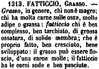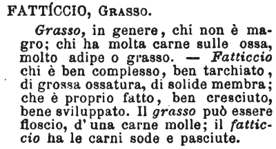 | Fatticcio, Grasso - Grasso, in genere, chi non è magro; chi ha molta carne sulle ossa, molto adipe o grassa: fatticcio chi è ben complesso, ben tarchiato, di grossa ossatura, di solide membra; che è proprio fatto, ben cresciuto, bene sviluppato: il grasso può essere floscio, d'una carne molle; il fatticcio ha le carni sode e ben pasciute. [immagine] |