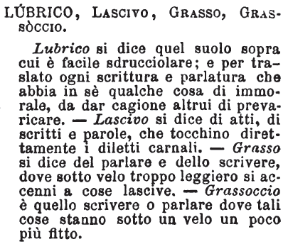 | Lubrico, Lascivo, Grasso, Grassoccio - Lubrico si dice quel suolo sopra cui è facile sdrucciolare; e per traslato ogni scrittura e parlatura che abbia in sè qualche cosa di immorale, da dar cagione altrui di prevaricare. - Lascivo si dice di atti, di scritti e parole, che tocchino direttamente i diletti carnali. - Grasso si dice del parlare e dello scrivere, dove sotto velo troppo leggiero si accenni a cose lascive. - Grassoccio è quello scrivere o parlare dove tali cose stanno sotto un velo un poco più fitto. [immagine] |