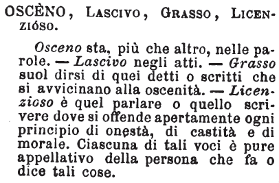 | Osceno, Lascivo, Grasso, Licenzioso - Osceno sta, più che altro, nelle parole. - Lascivo negli atti. - Grasso suol dirsi di quei detti o scritti che si avvicinano alla oscenità. - Licenzioso è quel parlare o quello scrivere dove si offende apertamente ogni principio di onestà, di castità e di morale. Ciascuna di tali voci è pure appellativo della persona che fa o dice tali cose. [immagine] |