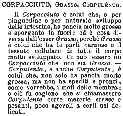 | Corpacciuto, Grasso, Corpulento - Il Corpacciuto è colui che, o per pinguedine o per naturale sviluppo delle intestina, ha pancia molto grossa e sporgente in fuori; ed è cosa diversa all'esser Grasso, perchè Grasso è colui che ha le parti carnose e il tessuto cellulare di tutto il corpo molto sviluppato. Ci può essere un Corpacciuto che non sia Grasso. - Corpulento, e anche Corpulente, è colui che, non solo ha pancia molto grossa, ma non ha spediti e pronti, come vorrebbe, i moti delle membra; e ciò fu cagione che si chiamassero Corpulente certe materie crasse e pesanti, poco agevoli a certi usi delicati. [immagine] |