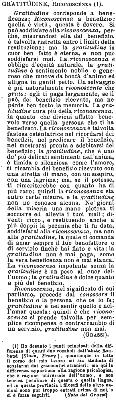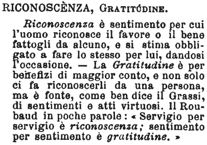 Riconoscenza, nel significato di cui parliamo, procede dal conoscere il benefizio o la persona che te lo fa; gratitudine è nel sentir quello e nell'amar questa: quindi è che riconoscenza si prende talvolta per semplice ricompensa o contraccambio di un servizio, gratitudine non mai.
