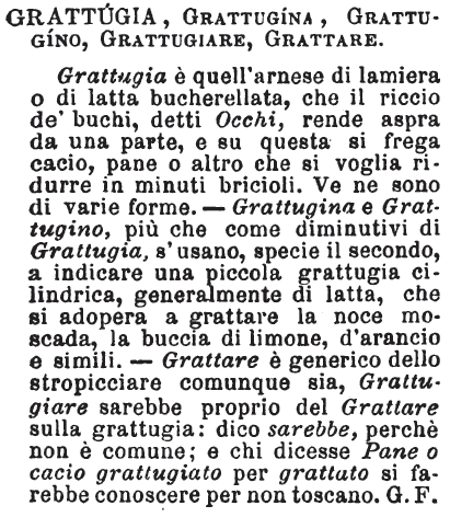 | Grattugia, Grattugina, Grattugino, Grattugiare, Grattare - Grattugia è quell'arnese di lamiera o di latta bucherellata, che il riccio de' buchi, detti Occhi, rende aspra da una parte, e su questa si frega cacio, pane o altro che si voglia ridurre in minuti bricioli. Ve ne sono di varie forme. - Grattugina e Grattugino, più che come diminutivi di Grattugia, s'usano, specie il secondo, a indicare una piccola grattugia cilindrica, generalmente di latta, che si adopera a grattare la noce moscada, la buccia di limone, d'arancio e simili. - Grattare è generico dello stropicciare comunque sia, Grattugiare sarebbe proprio del Grattare sulla grattugia: dico sarebbe, perchè non è comune; e chi dicesse Pane o cacio grattugiato per grattato si farebbe conoscere per non toscano. G. F. [immagine] |