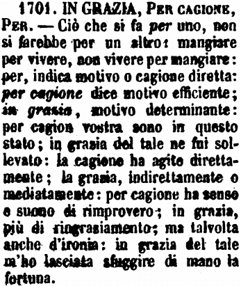 | In grazia, Per cagione, Per - Ciò che si fa per uno, non si farebbe per un altro: mangiare per vivere, non vivere per mangiare: per, indica motivo o cagione diretta: per cagione dice motivo efficiente; in grazia, motivo determinante: per cagion vostra sono in questo stato; in grazia del tale ne fui sollevato: la cagione ha agito direttamente; la grazia, indirettamente o mediatamente: per cagione ha senso e suono di rimprovero; in grazia, più di ringraziamento; ma talvolta anche d'ironia: in grazia del tale m'ho lasciata sfuggire di mano la fortuna. [immagine] |
