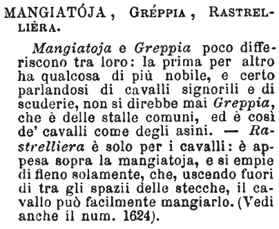 | Mangiatoia, Greppia, Presepe, Rastrelliera - Mangiatoia è cassetta o consimile recipiente dove si mette la biada o altro per dar da mangiare ai cavalli: poi il luogo della stalla ove cavalli o buoi e simili mangiano. Greppia, il luogo dove si mette la paglia, il fieno o l'erba davanti ai detti animali acciò li mangino: ogni animale ha la sua greppia. La rastrelliera corre da capo a fondo della stalla, è più alta, e contiene il fieno che i cavalli soli hanno da mangiare. Presepe è voce poetica e biblica che significa stalla, ma la stalla cogli animali; che se vuota, mi pare che presepe non la direi. Gesù Bambino nacque in un presepe, e fu accomodato in una mangiatoia. [immagine] |