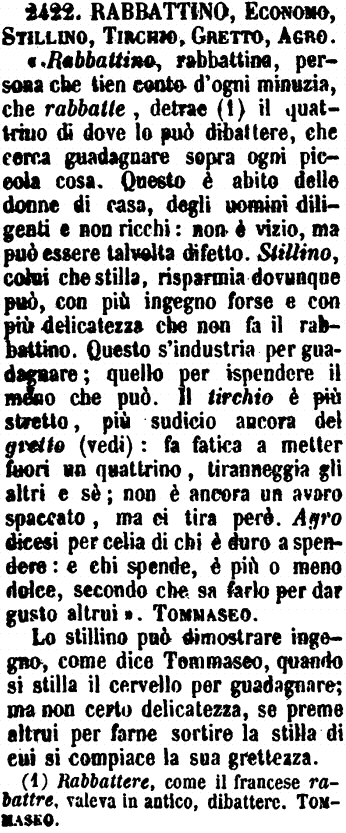 | Rabbattino, Economo, Stillino, Tirchio, Gretto, Agro - «Rabbattino, rabbattina, persona che tien conto d'ogni minuzia, che rabbatte, detrae (1) il quattrino di dove lo può dibattere, che cerca guadagnare sopra ogni piccola cosa. Questo è abito delle donne di casa, degli uomini diligenti e non ricchi: non è vizio, ma può essere talvolta difetto. Stillino, colui che stilla, risparmia dovunque può, con più ingegno forse e con più delicatezza che non fa il rabbattino. Questo s'industria per guadagnare; quello per ispendere il meno che può. Il tirchio è più stretto, più sudicio ancora del gretto (vedi): fa fatica a metter fuori un quattrino, tiranneggia gli altri e sè; non è ancora un avaro spaccato, ma ci tira però. Agro dicesi per celia di chi è duro a spendere: e chi spende, è più o meno dolce, secondo che sa farlo per dar gusto altrui». Tommaseo.