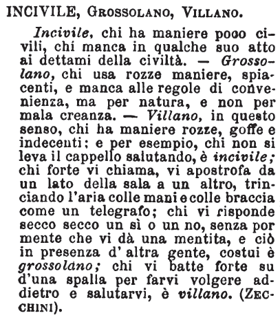 | Incivile, Grossolano, Villano - Incivile, chi ha maniere poco civili, chi manca in qualche suo atto ai dettami della civiltà: grossolano, chi usa cattive maniere, spiacenti, e manca alle regole di convenienza: villano, in questo senso, chi ha maniere rozze, goffe e indecenti; e per esempio: chi non si leva il cappello salutando, è incivile; chi forte vi chiama, vi apostrofa da un lato della sala a un altro, trinciando l'aria colle mani e colle braccia come un telegrafo; chi vi risponde secco secco un sì o un no, senza por mente che vi dà una mentita, e ciò in presenza d'altra gente, costui è grossolano: chi vi batte forte su d'una spalla per farvi volgere addietro e salutarvi, è villano. [immagine] |