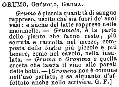 | Grumo, Grumolo, Gruma - Grumo è piccola quantità di sangue rappreso, uscito che sia fuori de' suoi vasi: e anche del latte rappreso nelle mammelle. - Grumolo, è la parte delle piante che fanno cesto, più serrata e raccolta nel mezzo, composta delle foglie più piccole e più tenere, come nel cavolo, nella insalata. - Gruma o Gromma è quella crosta che lascia il vino alle pareti delle botti. - [Gromma non è comune nell'uso parlato, e sa alquanto d'affettato anche nello scrivere. G. F.] [immagine] |