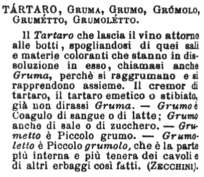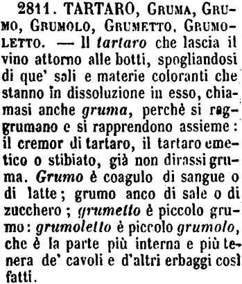 | Tartaro, Gruma, Grumo, Grumolo, Grumetto, Grumoletto - Il tartaro che lascia il vino attorno alle botti, spogliandosi di que' sali e materie coloranti che stanno in dissoluzione in esso, chiamasi anche gruma, perchè si raggrumano e si rapprendono assieme: il cremor di tartaro, il tartaro emetico o stibiato, già non dirassi gruma. Grumo è coagulo di sangue o di latte; grumo anco di sale o di zucchero; grumetto è piccolo grumo: grumoletto è piccolo grumolo, che è la parte più interna e più tenera de' cavoli e d'altri erbaggi così fatti. [immagine] |