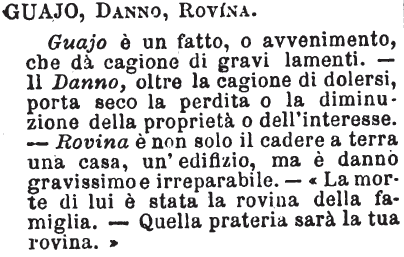 | Guajo, Danno, Rovina - Guajo è un fatto, o avvenimento, che dà cagione di gravi lamenti. - Il Danno, oltre la cagione di dolersi, porta seco la perdita o la diminuzione della proprietà o dell'interesse. - Rovina è non solo il cadere a terra una casa, un'edifizio, ma è danno gravissimo e irreparabile. - «La morte di lui è stata la rovina della famiglia. - Quella prateria sarà la tua rovina.» [immagine] |