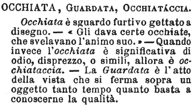 | Occhiata, Guardata, Occhiataccia - Occhiata è sguardo furtivo gettato a disegno. - «Gli dava certe occhiate, che svelavano l'animo suo.» - Quando invece l'occhiata è significativa di odio, disprezzo, o simili, allora è occhiataccia. - La Guardata è l'atto della vista che si ferma sopra un oggetto tanto tempo quanto basta a conoscerne la qualità. [immagine] |