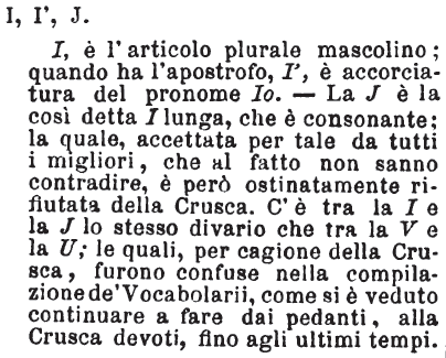| I, I’, J - I, è l'articolo plurale mascolino; quando ha l'apostrofo, I', è accorciatura del pronome Io. - La J è la così detta I lunga, che è consonante; la quale, accettata per tale da tutti i migliori, che al fatto non sanno contradire, è però ostinatamente rifiutata dalla Crusca. C'è tra la I e la J lo stesso divario che tra la V e la U; le quali, per cagione della Crusca, furono confuse nella compilazione de' Vocabolarii, come si è veduto continuare a fare dai pedanti, alla Crusca devoti, fino agli ultimi tempi. [immagine] |