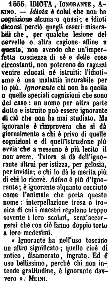 | Idiota, Ignorante, Asino - Idiota è colui che non ha cognizione alcuna o quasi; e idioti diconsi perciò quegli esseri miserabili che, per qualche lesione del cervello o altra cagione affine a questa, non avendo che un'imperfetta coscienza di sè e delle cose circostanti, non poterono da ragazzi venire educati nè istruiti: l'idiotismo è una malattia incurabile per lo più. Ignorante chi non ha quella o quelle speciali cognizioni che sono del caso: un uomo per altra parte dotto e istruito può essere ignorante di ciò che non ha mai studiato. Ma ignorante è rimprovero che si dà giornalmente a chi è privo di quelle cognizioni e di quell'istruzione più ovvia che a nessuno è più lecito il non avere. Talora si dà dell'ignorante altrui per istizza, per gelosia, per invidia; e chi lo dà lo merita più di chi lo riceve. Asino è più d'ignorante; è ignorante alquanto cocciuto come l'animale che porta questo nome: interpellazione irosa o ironica di cui i maestri regalano troppo sovente i loro scolari, senz'accorgersi che con ciò fanno doppio torto a loro medesimi.