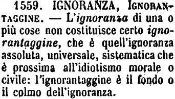 | Ignoranza, Ignorantaggine - L'ignoranza di una o più cose non costituisce certo ignorantaggine, che è quell'ignoranza assoluta, universale, sistematica che è prossima all'idiotismo morale o civile: l'ignorantaggine è il fondo o il colmo dell'ignoranza. [immagine] |