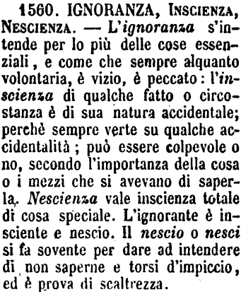 | Ignoranza, Inscienza, Nescienza - L'ignoranza s'intende per lo più delle cose essenziali, e come che sempre alquanto volontaria, è vizio, è peccato: l'inscienza di qualche fatto o circostanza è di sua natura accidentale; perchè sempre verte su qualche accidentalità; può essere colpevole o no, secondo l'importanza della cosa o i mezzi che si avevano di saperla. Nescienza vale inscienza totale di cosa speciale. L'ignorante è insciente e nescio. Il nescio o nesci si fa sovente per dare ad intendere di non saperne e torsi d'impiccio, ed è prova di scaltrezza. [immagine] |