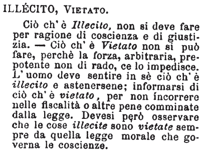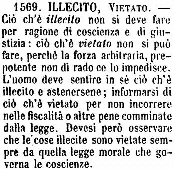 | Illecito, Vietato - Ciò ch'è illecito non si deve fare per ragione di coscienza e di giustizia: ciò ch'è vietato non si può fare, perchè la forza arbitraria, prepotente non di rado ce lo impedisce. L'uomo deve sentire in sè ciò ch'è illecito e astenersene; informarsi di ciò ch'è vietato per non incorrere nelle fiscalità o altre pene comminate dalla legge. Devesi però osservare che le cose illecite sono vietate sempre da quella legge morale che governa le coscienze. [immagine] |
