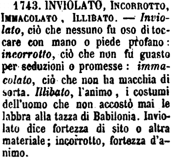 | Inviolato, Incorrotto, Immacolato, Illibato - Inviolato, ciò che nessuno fu oso di toccare con mano o piede profano: incorrotto, ciò che non fu guasto per seduzioni o promesse: immacolato, ciò che non ha macchia di sorta. Illibato, l'animo, i costumi dell'uomo che non accostò mai le labbra alla tazza di Babilonia. Inviolato dice fortezza di sito o altra materiale; incorrotto, fortezza d'animo. [immagine] |