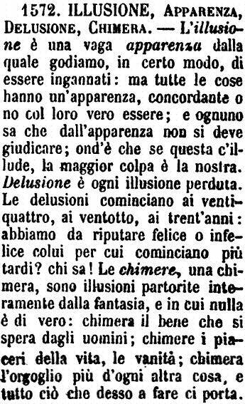 | Illusione, Apparenza, Delusione, Chimera - L'illusione è una vaga apparenza dalla quale godiamo, in certo modo, di essere ingannati: ma tutte le cose hanno un'apparenza, concordante o no col loro vero essere; e ognuno sa che dall'apparenza non si deve giudicare; ond'è che se questa c'illude, la maggior colpa è la nostra. Delusione è ogni illusione perduta. Le delusioni cominciano ai ventiquattro, ai ventotto, ai trent'anni: abbiamo da riputare felice o infelice colui per cui cominciano più tardi? chi sa! Le chimere, una chimera, sono illusioni partorite interamente dalla fantasia, e in cui nulla è di vero: chimera il bene che si spera dagli uomini; chimere i piaceri della vita, le vanità; chimera l'orgoglio più d'ogni altra cosa, e tutto ciò che desso a fare ci porta. [immagine] |