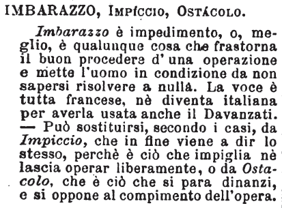 | Imbarazzo, Impiccio, Ostacolo - Imbarazzo è impedimento, o, meglio, è qualunque cosa che frastorna il buon procedere d'una operazione e mette l'uomo in condizione da non sapersi risolvere a nulla. La voce è tutta francese, nè diventa italiana per averla usata anche il Davanzati. - Può sostituirsi, secondo i casi, da Impiccio, che in fine viene a dir lo stesso, perchè è ciò che impiglia nè lascia operar liberamente, o da Ostacolo, che è ciò che si para dinanzi, e si oppone al compimento dell'opera. [immagine] |