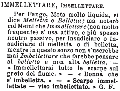 | Immellettare, Imbellettare - Per Fango, Mota molto liquida, si dice Melletta e Belletta; ma noterò col Meini che Immellettare (non molto frequente) s'usa attivo, e più spesso neutro passivo, per Insudiciare o Insudiciarsi di melletta o di belletta, mentre in questo senso non s'userebbe mai Imbellettare che farebbe pensare al belletto e non alla belletta. - «Immellettarsi tutte le scarpe sul greto del fiume.» - «Donna che s'imbelletta.» - «Scarpe immellettate - viso imbellettato.» G. F. [immagine] |